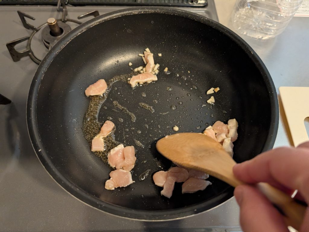 まずはごま油を敷いたフライパンで鶏胸を炒める。
