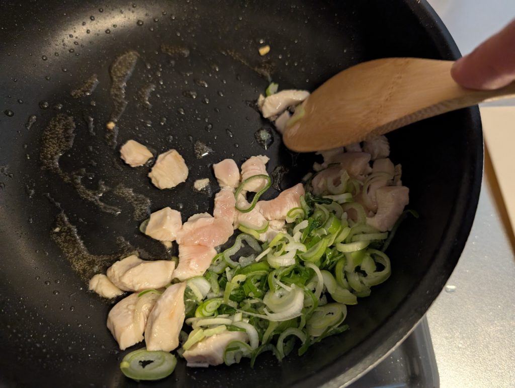 切ったネギの半分は肉と炒めてネギエキスを抽出する。