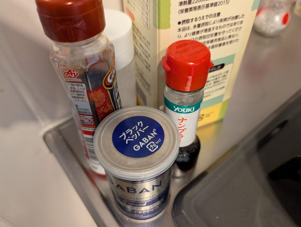 少し炒めた後に、塩コショウ、追い油、ナンプラー、オイスターソース、味の素で味をつけてよく炒める。
