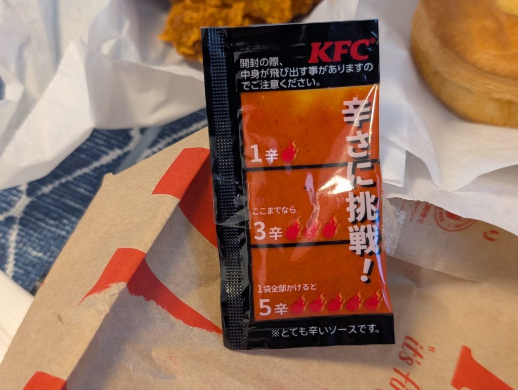 注文したのは、レッドホットチキンとオリジナルチキンそれとビスケットとコールスローにレッドホットチキン用の激辛ソース。