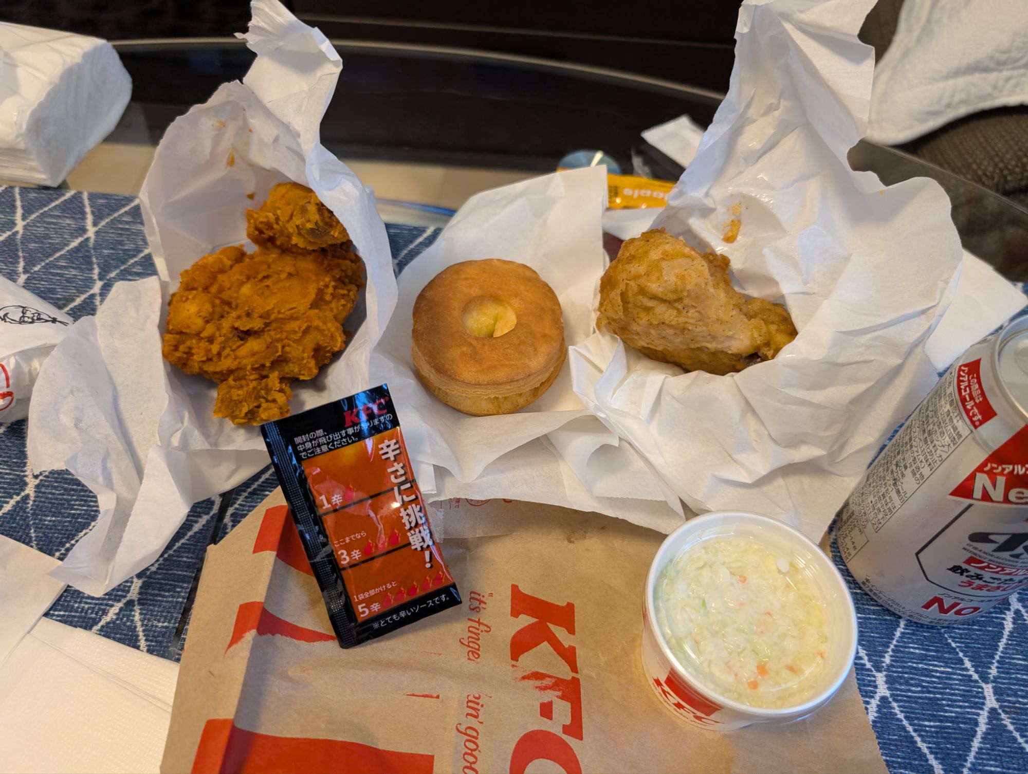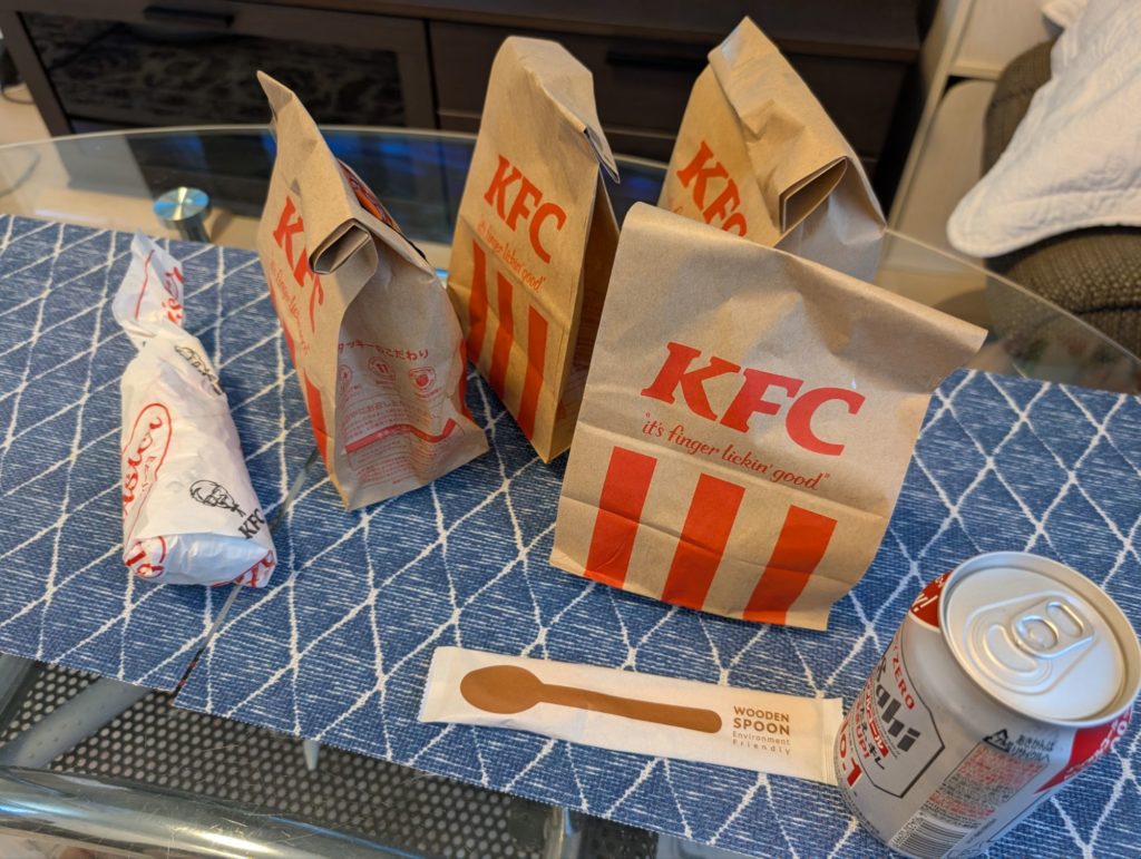 家に帰り、もう待ちきれないケンタッキーをビニールから取り出して机に並べておうちランチの準備をする。