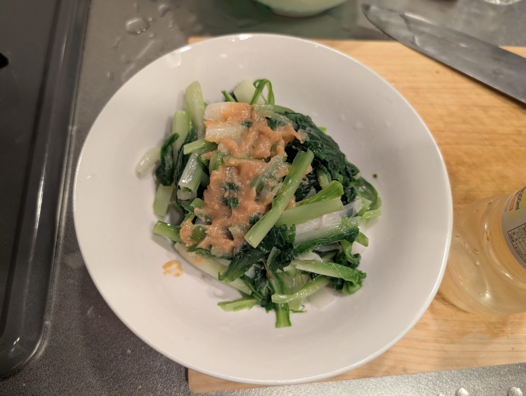 食べ方をググると酢味噌が合うということだったので、ざく切りにして茹でて、適当に合わせて作った酢味噌を付けて食べた。